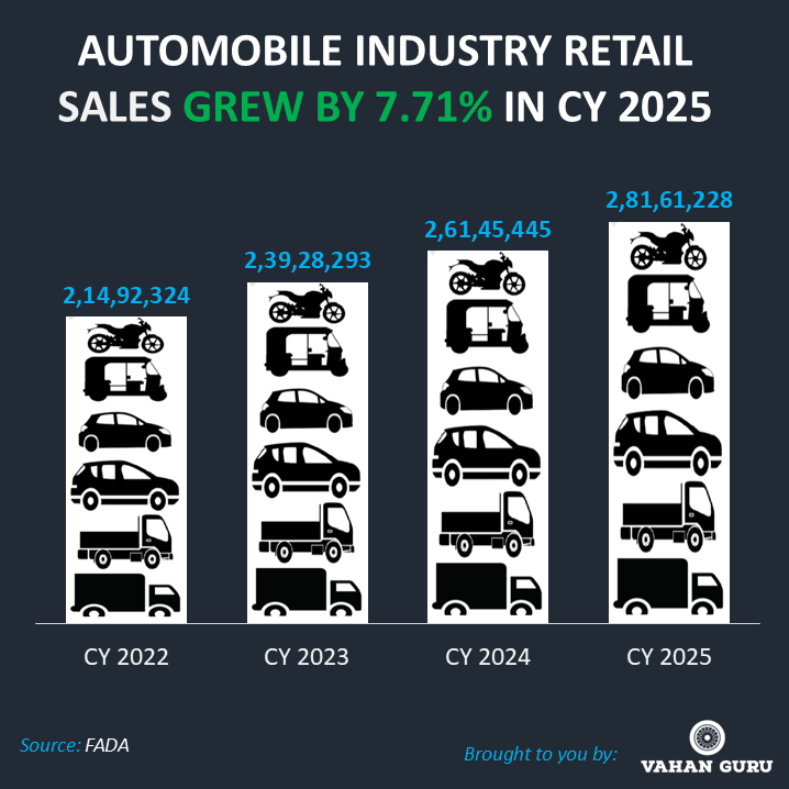 India’s automobile industry witnessed a strong and resilient performance in Calendar Year (CY) 2025, emerging as one of the key pillars of the country’s economic momentum. Total vehicle retail sales reached 2,81,61,228 units, registering a 7.71% year-on-year (YoY) growth over CY 2024. This growth was not driven by a single market but by the combined strength of urban stability and rural resurgence, making urban–rural market dynamics central to India’s automobile growth story.