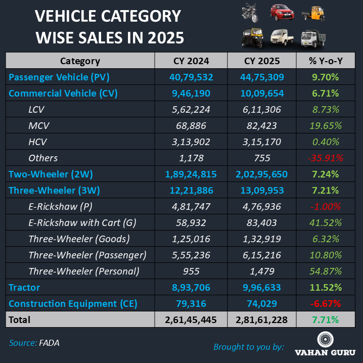 Passenger Vehicles (PV) delivered one of the strongest performances in CY 2025, with sales rising to 44,75,309 units, up from 40,79,532 units in CY 2024, marking a 9.70% YoY growth. Compact SUVs, deeper rural penetration, and improved affordability post-GST rationalisation supported growth, while urban markets continued to lead premium and feature-rich vehicle demand.
