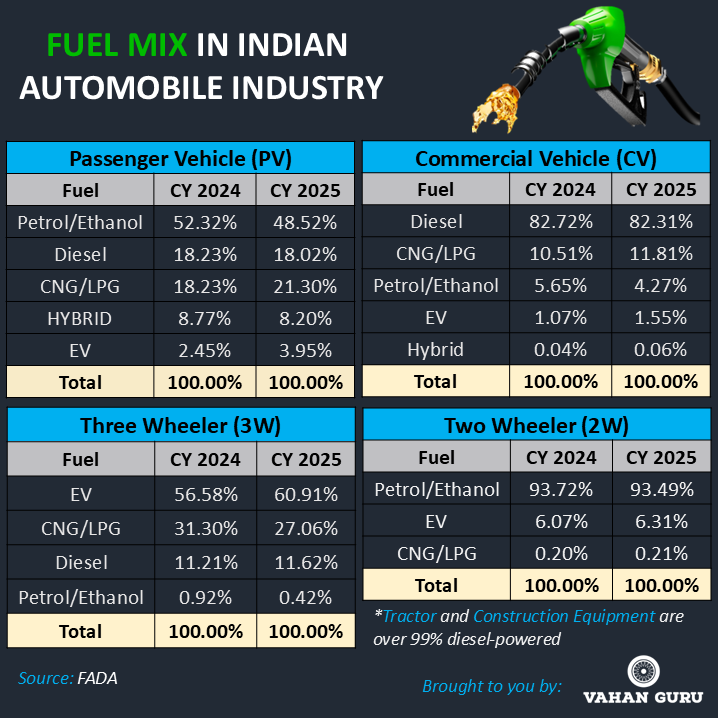 CY 2025 marked a decisive shift toward cleaner mobility across India. While petrol and diesel remained dominant, CNG and electric vehicles (EVs) gained rapid traction.
