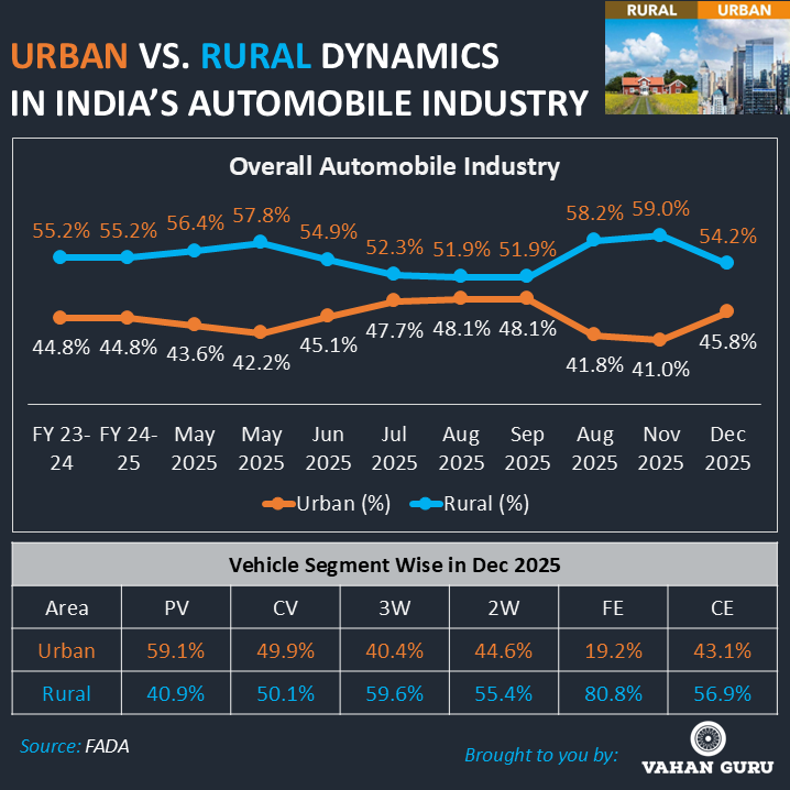 Rural India has firmly established itself as the backbone of India’s automobile industry. Rural markets accounted for over 52% of total vehicle sales consistently across FY 2023–24, FY 2024–25, and CY 2025, peaking at 59% in November 2025. In contrast, urban markets maintained a steady 41–48% share, reflecting maturity and saturation in metros.